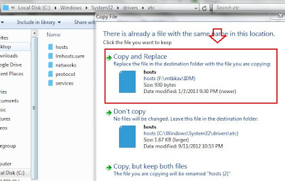 Nếu Trong C:\Windows\System32\drivers\etc có sẵn file hosts mặc định của windows rồi thì: 1 là cut file hosts cũ ra chỗ khác, copy file hosts mới vào, 2 là chép đè lên